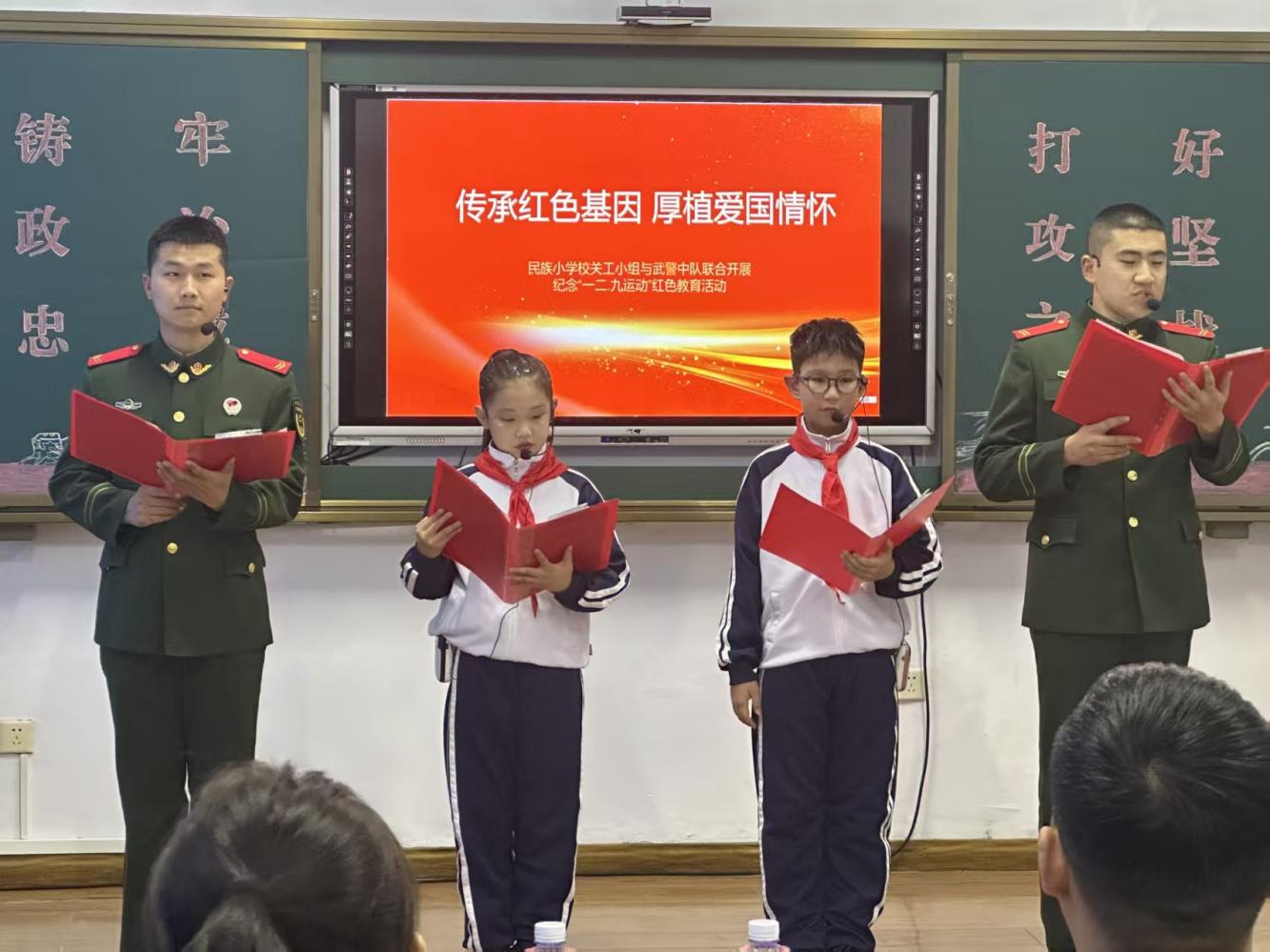 活动现场,民族小学的同学们身着整洁校服,与身着橄榄绿军装的武警战士们并肩而立,精神抖擞。朗诵环节中,《九十年前的那一声呐喊》、《青春中国,我与你同行》臧日东同志的《当你的秀发拂过我的钢枪》等经典篇目轮番呈现。同学们的朗诵稚嫩却坚定,饱含着对革命先辈的崇敬之情;武警战士们的朗诵铿锵有力、气势恢宏,展现出新时代军人的责任与担当。当学生与战士们齐声朗诵时,激昂的语调、真挚的情感回荡在活动现场,深深感染着每一位在场人员,让大家在朗朗书声中重温了“一二·九运动”的峥嵘岁月,感受到了中华儿女不屈不挠的抗争精神。